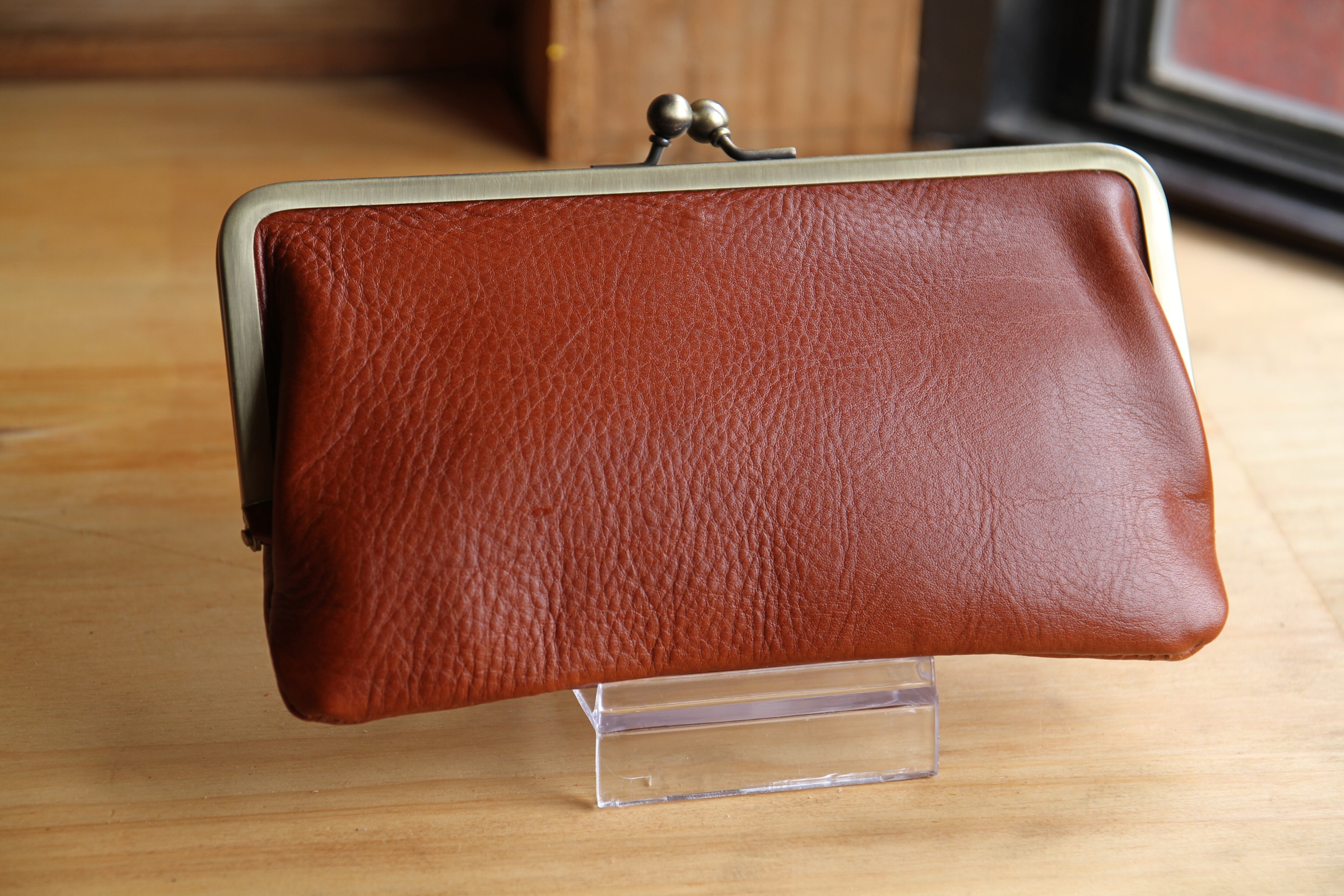 シンプルながま口長財布を作りました。本革を使用しており、高級感がありながらもシンプルなデザインで幅広い世代に人気です。特に、がま口式の開閉は使いやすく、小銭を取り出しやすいので忙しい日常生活でも便利にご利用いただけます。