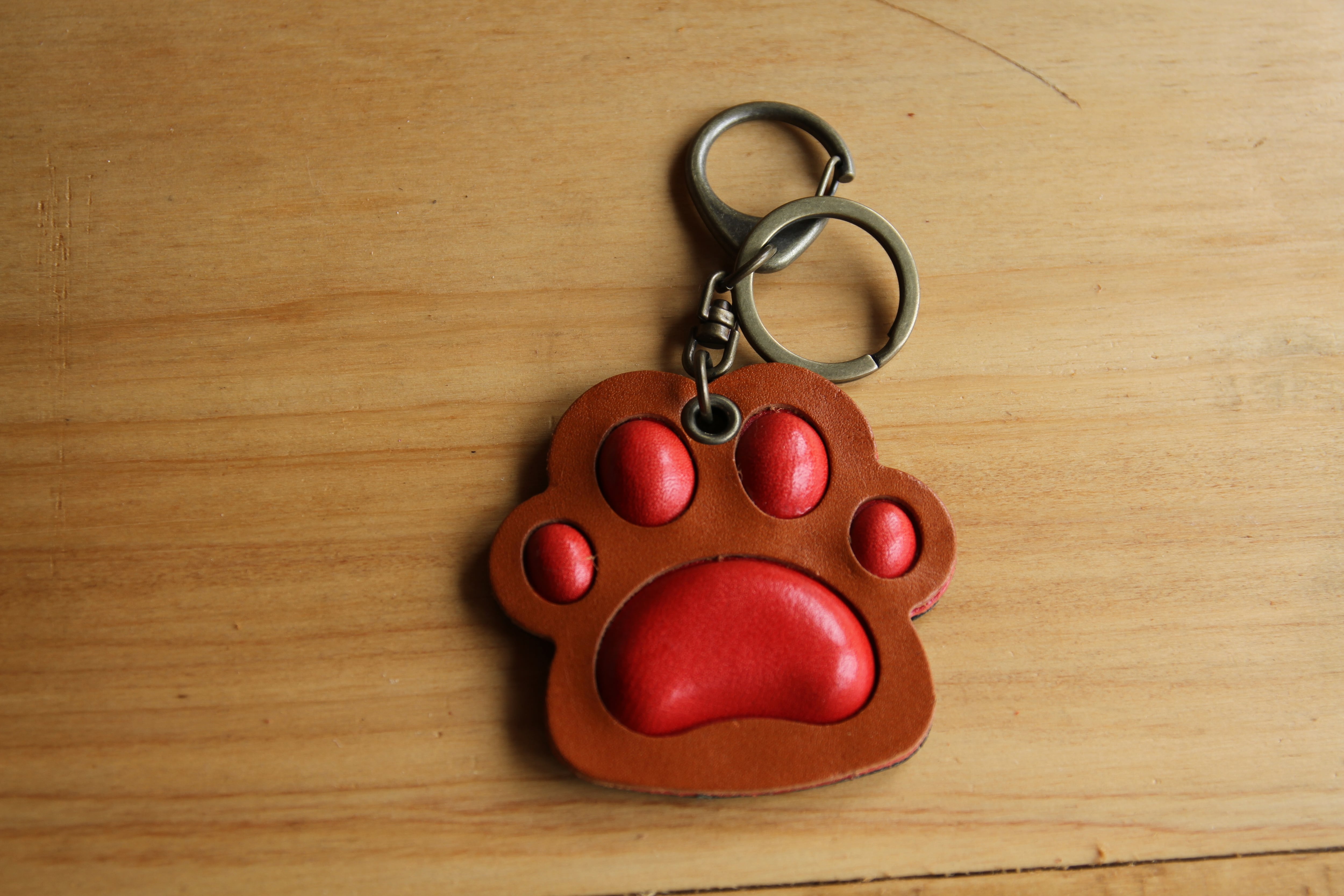 可愛らしい肉球のデザインが魅力の本革キーホルダー。手触りの良いぷよぷよ感がたまらなく、持つ度に癒しを感じられるアイテムです。手作りのため、一つ一つ表情や色味が異なり、世界に一つだけの特別感があります。バッグや鍵に付けて、日常の中に癒しと愉しみをプラスしてください。この肉球キーホルダーがあなたの毎日を楽しく彩りますように。